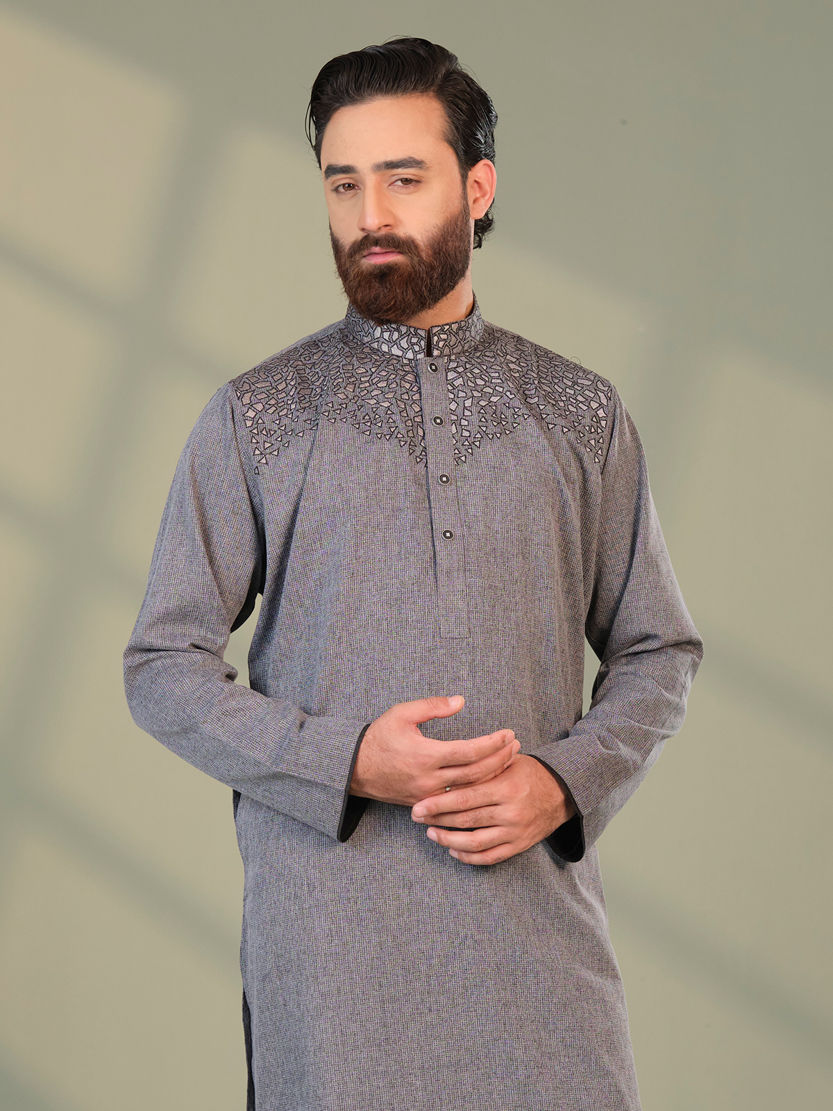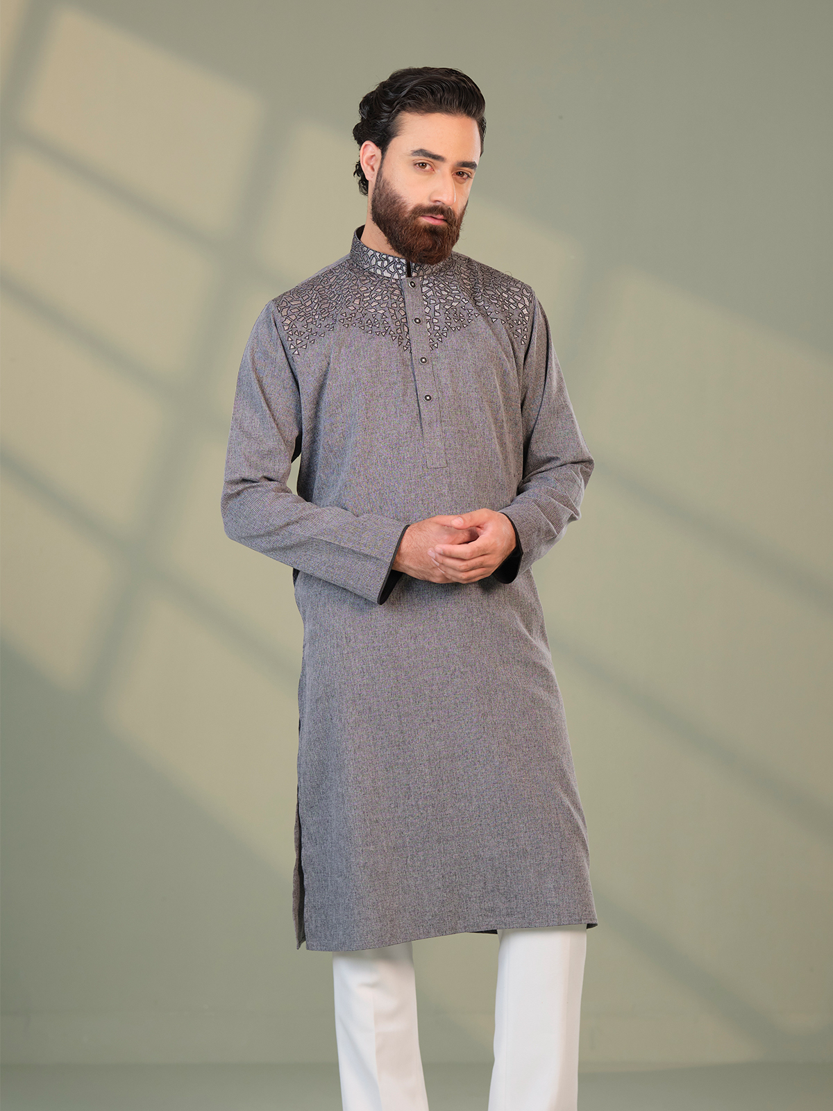 Made from premium breathable cotton fabric, this long panjabi is ideal for Bangladesh’s warm and humid climate. The lightweight material ensures excellent airflow while maintaining a structured and polished appearance throughout the day. Its subtle ash grey tone combined with detailed embroidery creates a stylish yet understated look, making it perfect for Eid celebrations, weddings, cultural programs, and formal gatherings.