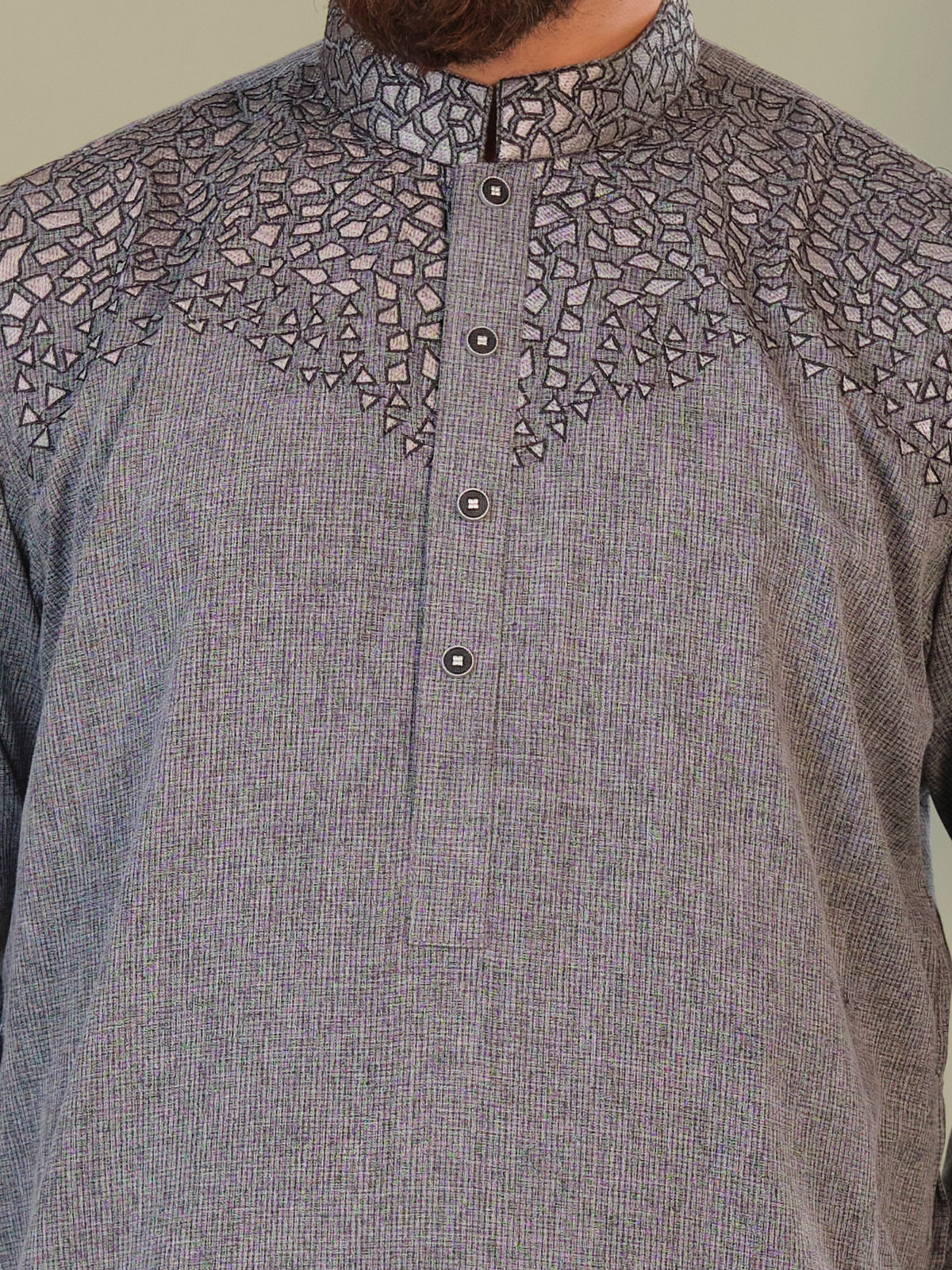 Discover refined elegance with the adlib Premium Cotton Men's Long Panjabi in Elegant Ash, a sophisticated traditional outfit crafted for modern men who appreciate timeless style and comfort. Designed with intricate geometric embroidery across the chest and collar, this panjabi brings together classic craftsmanship and contemporary design for a distinguished look.