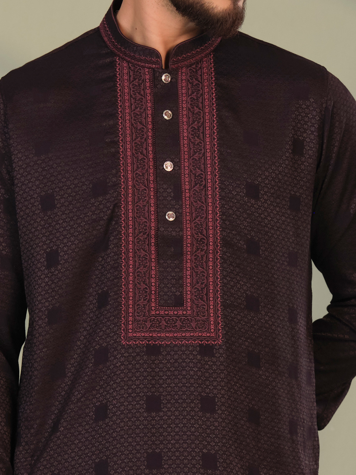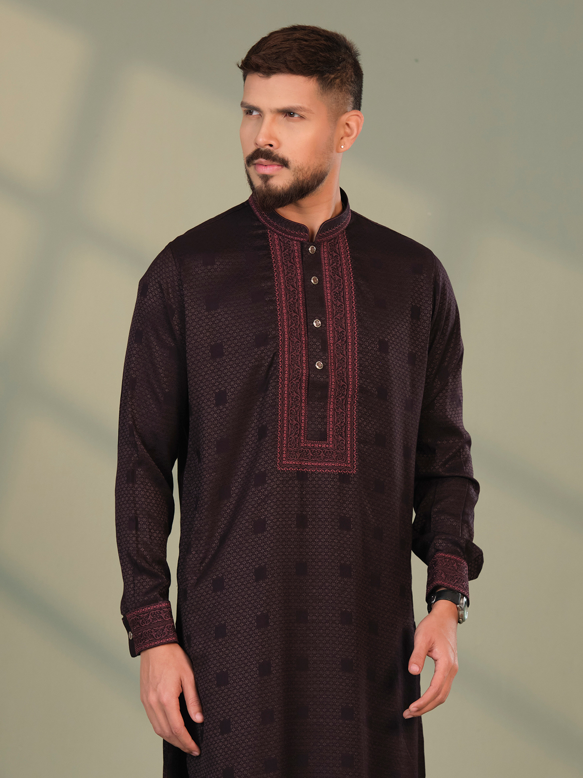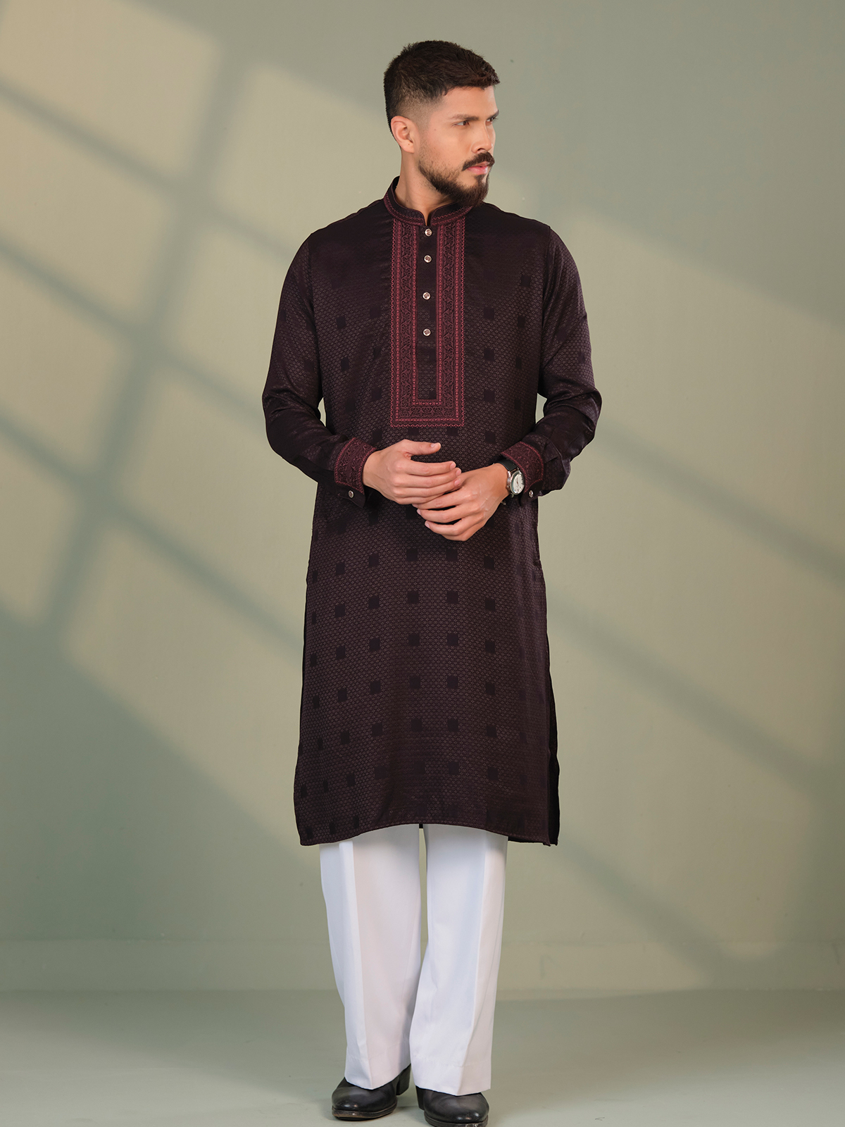 Made from premium breathable cotton fabric, this long panjabi ensures exceptional comfort in the warm and humid climate of Bangladesh. The lightweight material allows excellent airflow while maintaining a polished and structured look throughout the day. Its rich black tone with intricate embroidery adds depth and elegance, making it a perfect choice for Eid celebrations, weddings, cultural events, and evening occasions.
