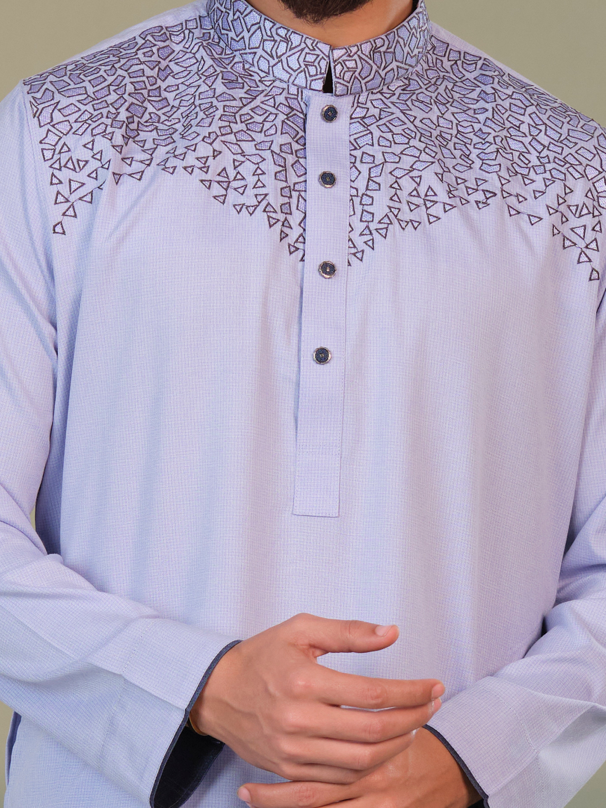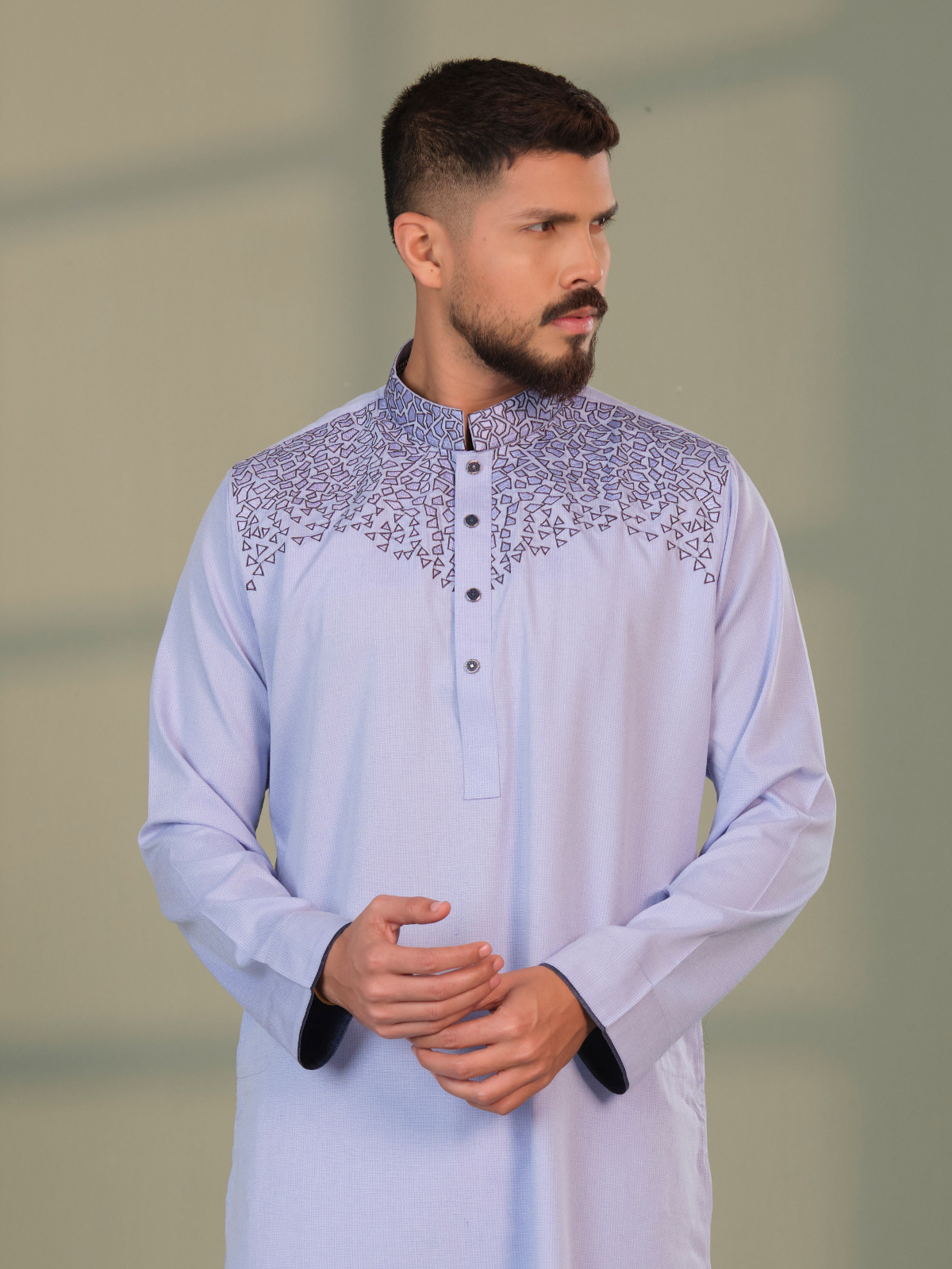 Redefine festive elegance with the adlib Premium Jacquard Cotton Men's Long Panjabi in Lavender Blue, designed for men who appreciate timeless tradition blended with modern sophistication. This beautifully crafted panjabi features intricate geometric embroidery across the chest and collar area, creating a refined and luxurious statement.