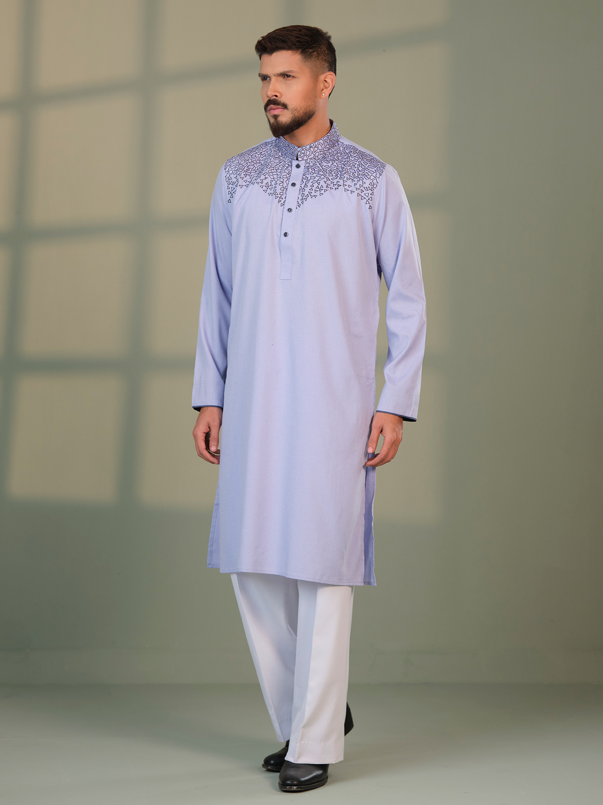 Pair this Lavender Blue Long Panjabi with a crisp white pajama or churidar and brown leather sandals or mojaris for a complete festive outfit.