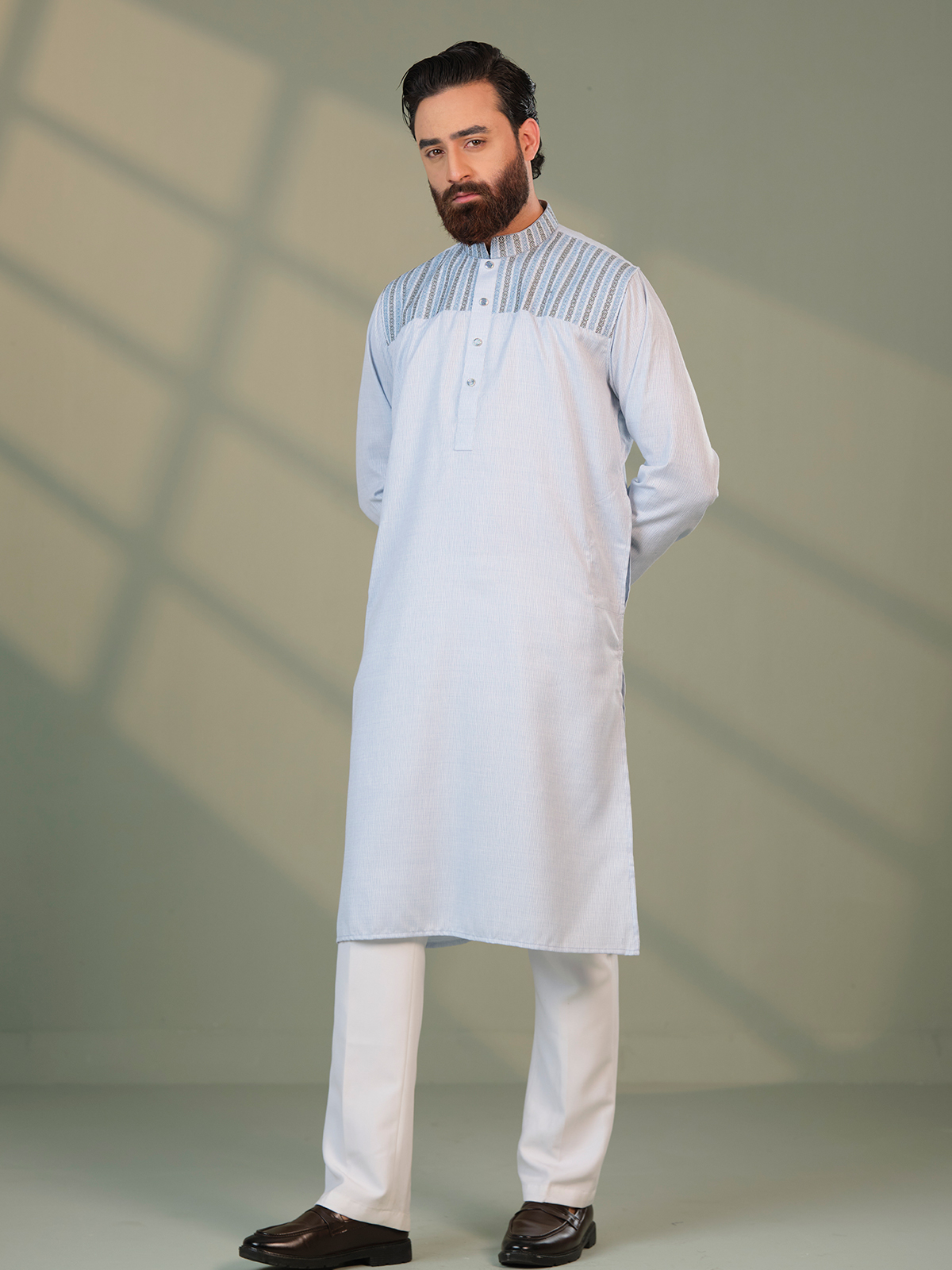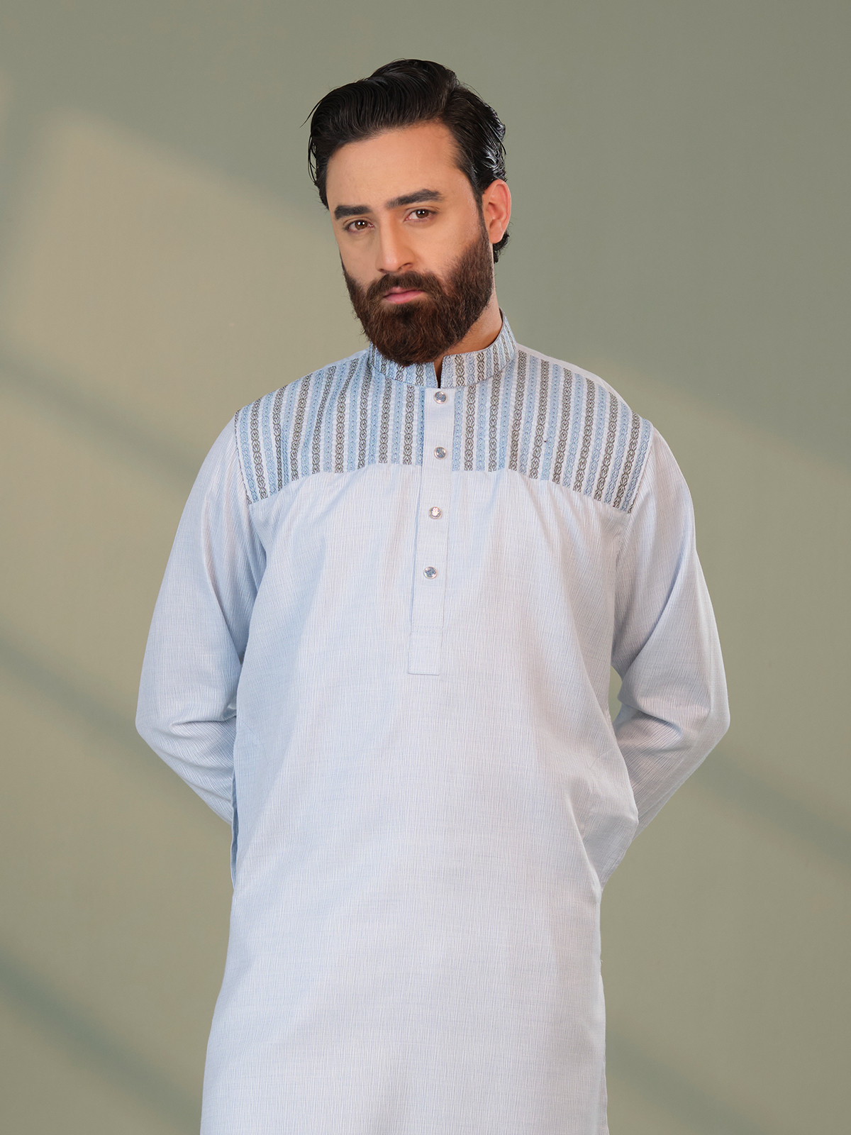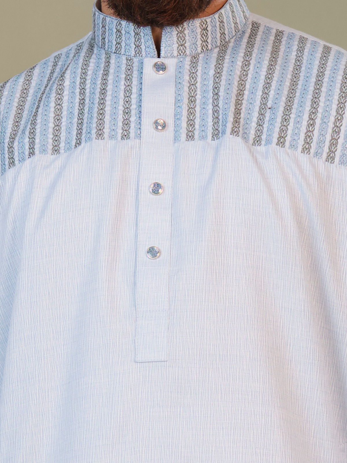 Made from premium breathable cotton fabric, this long panjabi is perfectly suited for the warm and humid climate of Bangladesh. The lightweight material ensures excellent airflow and comfort throughout the day while maintaining a polished and structured appearance. Its subtle silver tone paired with elegant embroidered detailing creates a graceful and luxurious aesthetic, making it an ideal choice for Eid celebrations, weddings, cultural events, and festive gatherings.
