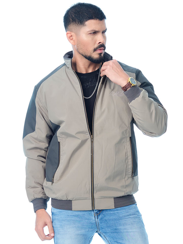 The jacket features a stylish color-block design with a main body in a contemporary taupe/light khaki hue, beautifully contrasted by darker charcoal grey panels across the shoulders and sleeves. It maintains the classic bomber silhouette with a stand collar and rib-knit cuffs and hem for a snug, structured fit. Designed for comfort and warmth, this premium piece justifies its $\text{3090 BDT}$ price tag. It's ideal for layering over a T-shirt or casual shirt to instantly elevate your look.