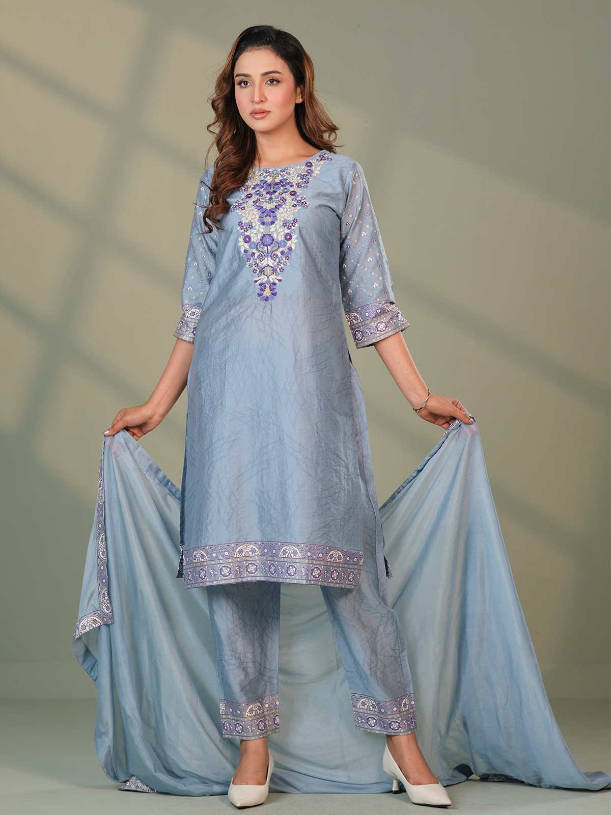 Pair this Sky Blue Ladies Three Piece with nude or white heels and statement earrings for a graceful festive look. A soft makeup palette will further enhance the elegant tone of the outfit.