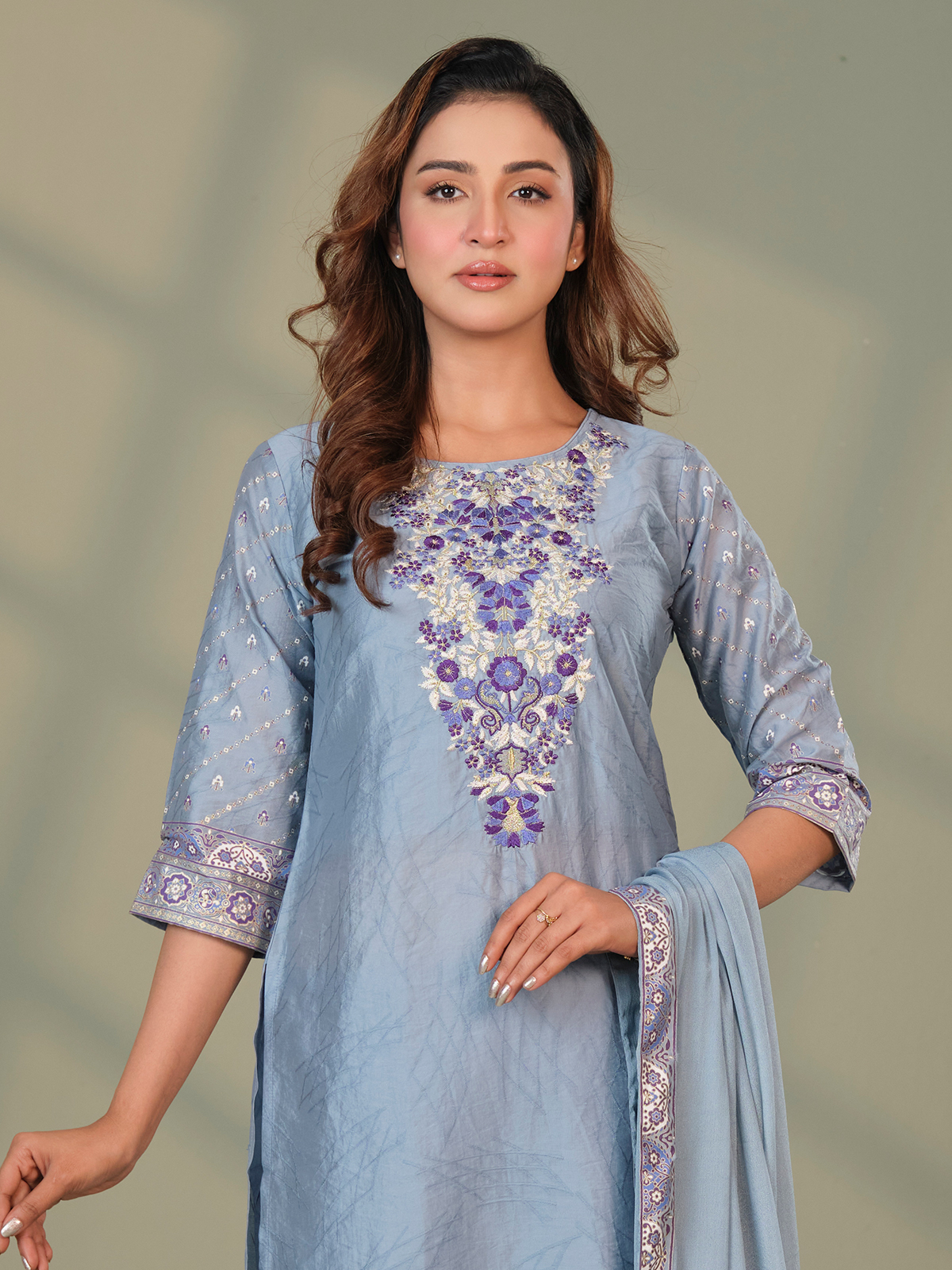 Crafted from premium breathable lawn fabric, this three-piece set ensures exceptional comfort in Bangladesh’s warm and humid climate. The graceful sky blue shade, complemented by intricate printed detailing and delicate embellishment around the neckline, creates a fresh and sophisticated look ideal for Eid celebrations, family gatherings, office events, and festive occasions.