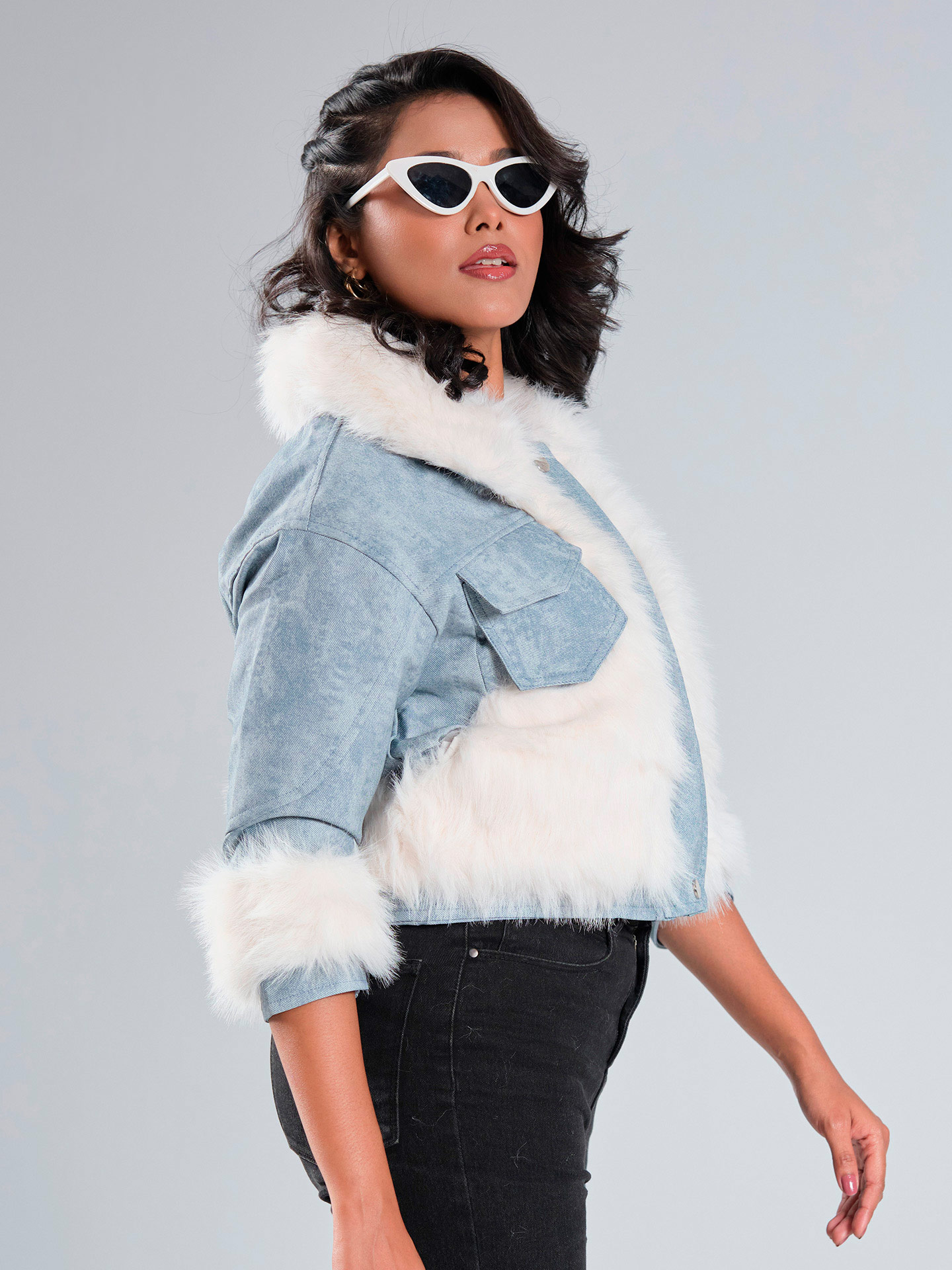 Stay warm and stylish with this Ladies Blue Faux Fur Jacket from adlib CHANGING LIFE STYLE. Designed with a luxurious combination of soft blue suede-finish fabric and plush white faux fur, this jacket brings a bold, modern, and premium winter look. The fur-detailed collar, front panel, and sleeve edges add a glamorous touch, while the front flap pockets and snap-button closure enhance both style and convenience.